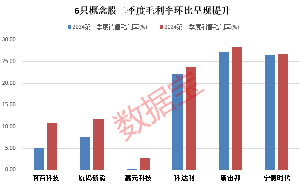 目前仅9股发布了半年报。从二季度的毛利率数据来看,宏发股份、新宙邦、璞泰来、宁德时代、科达利的毛利率居前,均超20%;环比一季度来看,9股中有6股的毛利率环比呈现提升,其中容百科技、厦钨新能、嘉元科技的毛利率分别环比提升5.69、4.02和2.61个百分点。