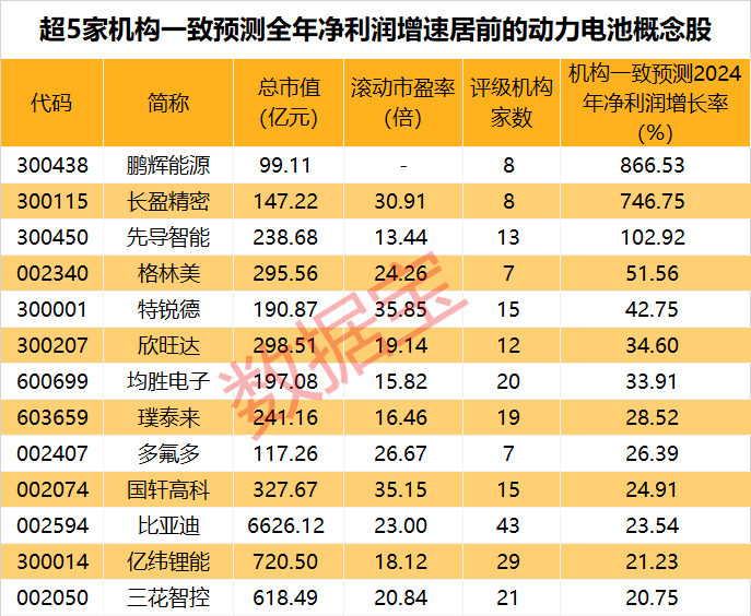 从全年业绩预期来看,超5家机构一致预测长盈精密、格林美、特锐德、欣旺达、均胜电子今年全年净利润有望大幅增长,增幅均超30%。