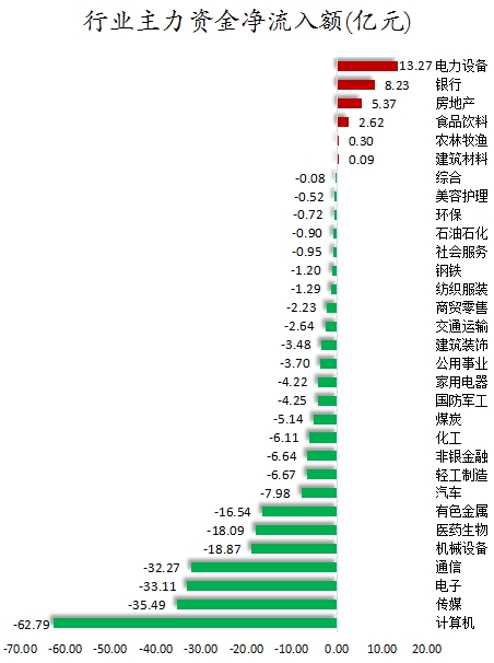 从行业板块来看,申万所属的31个一级行业,今日有6个行业板块主力资金呈现净流入,其中,电力设备行业板块主力资金净流入最多,净流入金额为13.27亿元;行业板块主力资金净流入居前的还有银行、房地产,净流入金额分别为8.23亿元、5.37亿元。25个行业板块主力资金呈现净流出,其中,计算机行业板块主力资金净流出最多,净流出金额为62.79亿元;行业板块主力资金净流出靠前的还有传媒、电子、通信、机械设备、医药生物、有色金属,净流出金额分别为35.49亿元、33.11亿元、32.27亿元、18.87亿元、18.09亿元、16.54亿元。