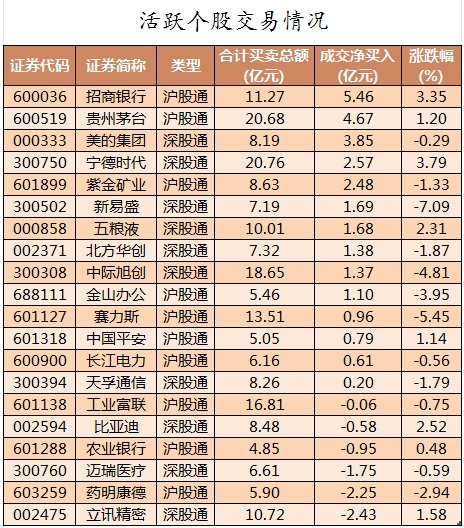 活跃个股方面,北向资金今日净买入较多的有招商银行、贵州茅台、美的集团、宁德时代、紫金矿业,净买入金额分别为5.46亿元、4.67亿元、3.85亿元、2.57亿元、2.48亿元。北向资金净卖出较多的有立讯精密、药明康德、迈瑞医疗,净卖出金额分别为2.43亿元、2.25亿元、1.75亿元。