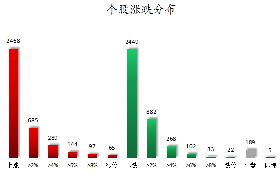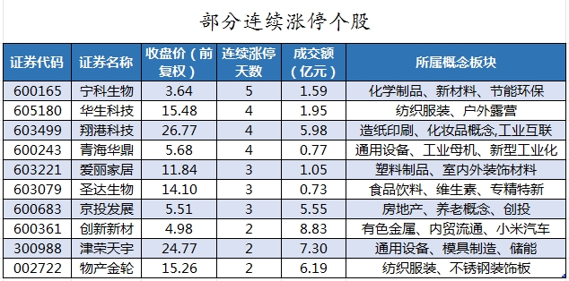 截至收盘,沪深两市合计2468只个股上涨,2449只个股下跌,平盘个股189只,停牌的个股5只。不含当日上市新股,共有65只个股涨停,22只个股跌停。从连续涨停天数看,宁科生物已连收5个涨停板,连续涨停板数量最多。