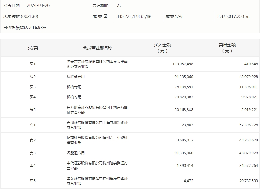 沃尔核材今天涨3.53%。盘后数据显示,2个机构出现在龙虎榜单上,合计净买入1.28亿元;国泰君安证券股份有限公司南京太平南路证券营业部买入1.19亿元,同时卖出41.06万元;招商证券股份有限公司福州六一中路证券营业部买入368.5万元,同时卖出4325.37万元。
