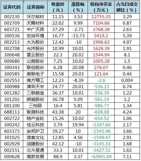 盘后龙虎榜数据显示,今日机构席位资金合计净卖出约2.39亿元。其中,净买入的个股10只,净卖出的个股13只。机构净买入最多的股票是沃尔核材,净买入金额约1.28亿元;机构净买入居前的还有天赐材料、中广天择、农尚环境等股。机构净卖出最多的股票是高新发展,净卖出金额约4.3亿元;机构净卖出居前的还有北斗星通、润建股份、读客文化等股。