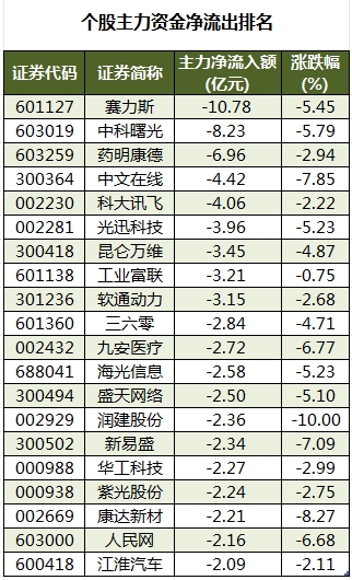 此外,3333只个股被主力资金净卖出,其中,56股被主力资金净卖出超1亿元。主力资金净流出最多的个股是赛力斯,净流出金额为10.78亿元;主力资金净流出居前的个股还有中科曙光、药明康德、中文在线、科大讯飞、光迅科技,净流出金额分别为8.23亿元、6.96亿元、4.42亿元、4.06亿元、3.96亿元。