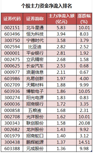 个股来看,今日有1767只个股获主力资金净流入,其中,30股获主力资金净流入超1亿元。北斗星通主力资金净流入最多,净流入金额为5.83亿元;主力资金净流入居前的个股还有恒为科技、宁德时代、比亚迪、平安银行、立讯精密,流入金额分别为3.94亿元、3.58亿元、2.82亿元、2.81亿元、2.68亿元。
