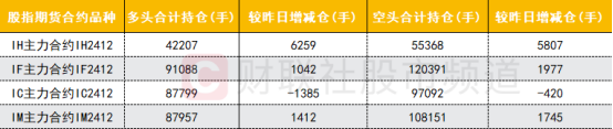 四大期指主力合约中,IH、IF、IM合约多空双方均大幅加仓,其中IH合约多头加仓数量较多,IF、IM合约空头加仓数量较多;IC合约多空双方均减仓,多头减仓数量明显大于空头。
