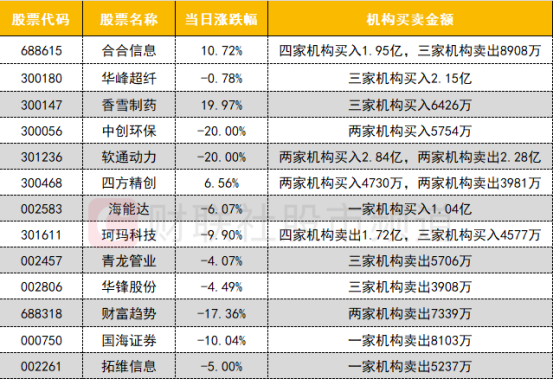 龙虎榜机构活跃度明显较高,买入方面,次新股合合信息获机构买入1.95亿;CIPS概念股华峰超纤获机构买入超2.15亿;软通动力、四方精创均遭机构激烈博弈。