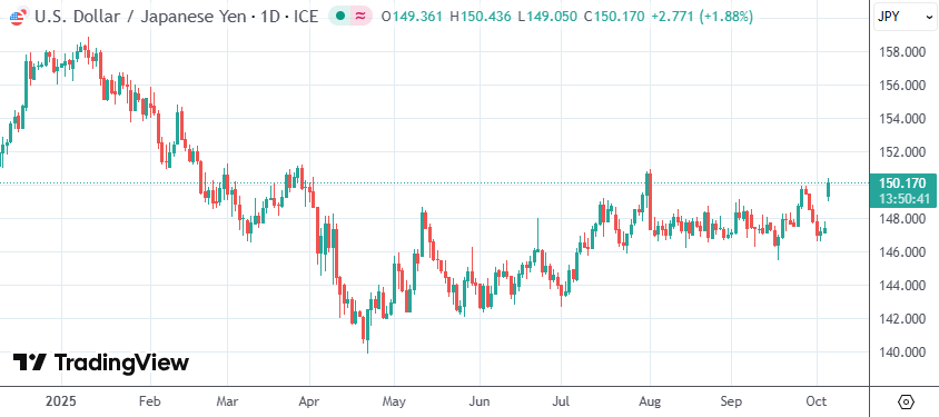 周一(10月6日),日本股市大幅走强,两大基准指数双双收于新高;与此同时,日元汇率明显走弱,交投于1美元兑150日元水平附近。
