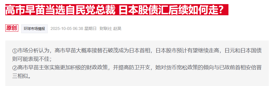 日内早些时候,德意志银行在研报中写道:“我们的基准情境是,随着市场的持续调整,日元短期可能贬至150,但不会出现更大幅度的走弱。”消息面上,日本前经济安全保障担当大臣高市早苗在上周六举行的日本自民党总裁选举中胜出,由此成为自民党首位女总裁,并有望成为日本首位女首相。高市现年64岁,是日本右翼政客代表人物之一,在去年自民党总裁选举决胜轮中败给现任首相石破茂。她主张实施更加积极的财政政策,并提高防卫开支。财联社一年前的报道就提到,作为已故前首相安倍晋三的门徒,高市早苗对货币宽松政策的倾向也与安倍有些相似,她曾在一场辩论会上说道“利率应保持在一个较低的水平”。