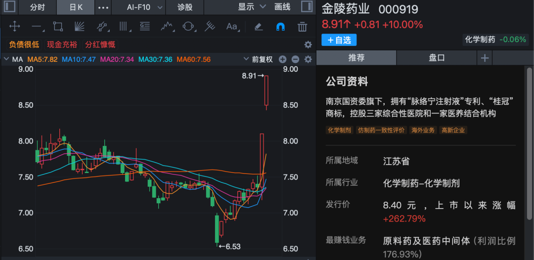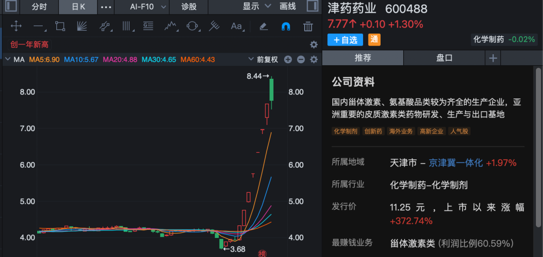津药药业盘中一度涨停,走出8连板,随后股价走低,截至发稿涨幅收窄至1.3%。