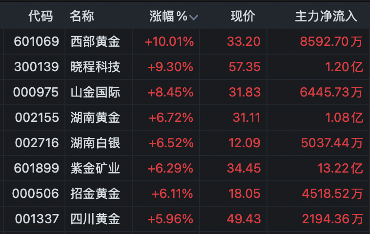 盘初,贵金属概念股集体走强,黄金股大涨。西部黄金涨停,山金国际、湖南黄金、紫金矿业、招金黄金、四川黄金等多股涨超5%。消息面上,今天早盘,金银价格拉升,现货黄金一度站上4850美元/盎司,日内涨逾3%。