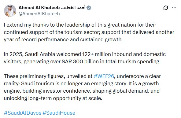 Ahmed指出,这些在2026年世界经济论坛上公布的初步数据,印证了沙特旅游业已不再是一个新兴产业,而是成为推动经济增长的关键引擎。它正有力地增强投资者信心、创造全球需求,并释放大规模的长期发展机遇。