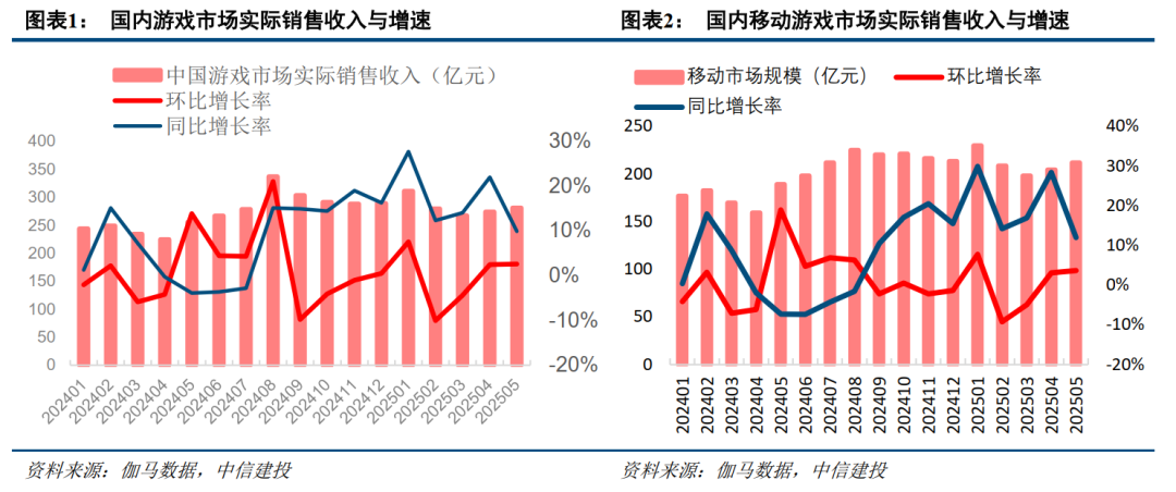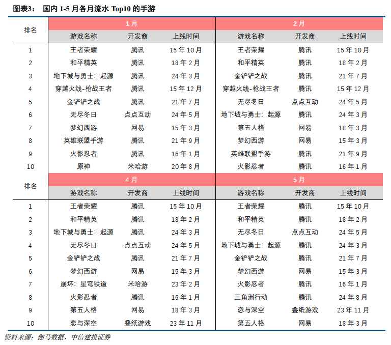 头部公司长青游戏稳中有升,中型公司新产品频超预期。根据伽马数据统计的手游流水榜单,1-5月各月排名前10的游戏大部分是24年之前上线的游戏。这些长青游戏流水持续增长,例如网易《第五人格》上线已经7年,据点点数据一季度流水同比增长50%以上;《和平精英》在5月17日开启SS33赛季,上线全新枪械皮肤、地铁物资、时光福利碎片等活动,赛季更新当日登上App Store畅销总榜榜首。部分中小体量新游表现同样较好,例如巨人网络《超自然行动组》、吉比特《问剑长生》《杖剑传说》。