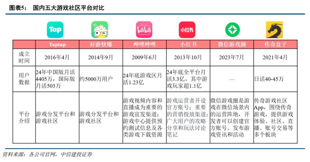 游戏用户侧活跃度高,国内游戏社区平台有望直接受益。当前国内主要的游戏社区平台包括TapTap、好游快爆、传奇盒子、小红书、哔哩哔哩和微信游戏圈。TapTap与好游快爆的模式类似,都定位为游戏分发渠道和游戏社区,但TapTap社区的活跃度更高、公信力更强。小红书和哔哩哔哩都是综合性的社区平台,既是用户分享游戏内容的平台,也是重要的内容营销投放渠道。微信游戏圈是微信23年新发布的板块,依托微信的高社交黏性,游戏运营者可以建立私域圈子,用户也可以看到其他好友发布的游戏动态。传奇盒子则聚焦传奇游戏赛道,提供游戏体验、社区、直播、账号交易等多个板块,目前日活40-45万。