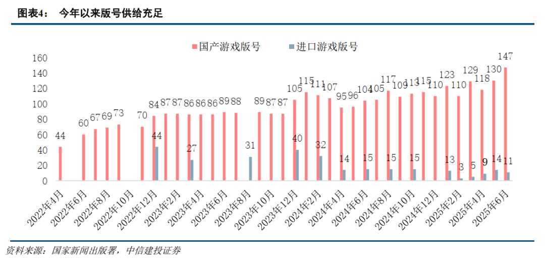 政策回暖,供给端同样高景气。从版号数量看,1-6月发布国产游戏版号757款,同比增长21%,其中6月国产版号147款,同比增长41%,环比增长13%,创22年以来单月新高,包括恺英《斗罗大陆》、巨人《无尽修仙》;1-6月进口版号55款,同比基本持平,但发放频率缩短至每月一次。从游戏政策看,今年以来游戏政策暖风频吹,既包括国家层面的支持文化出海、文化强国、网络出版的减税与IPO再融资,也包括地方层面的行业政策扶持、版号审批程序简化等。