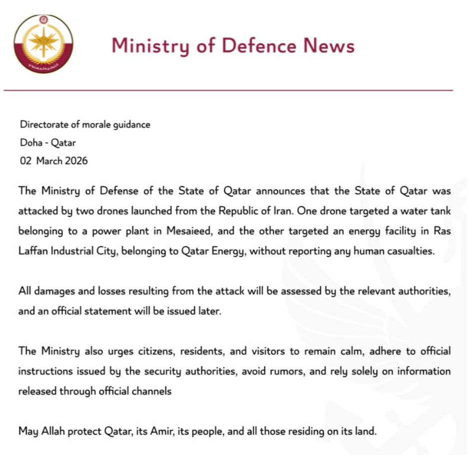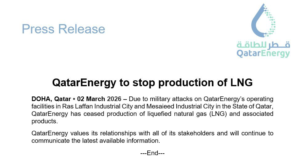 公司在声明中写道:“由于卡塔尔能源位于卡塔尔国拉斯拉凡工业城(Ras Laffan Industrial City)和梅赛义德工业城(Mesaieed Industrial City)的运营设施遭到军事袭击,卡塔尔能源已停止液化天然气(LNG)及相关产品的生产。”
