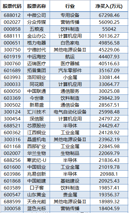 本周北上资金净买入较多的个股