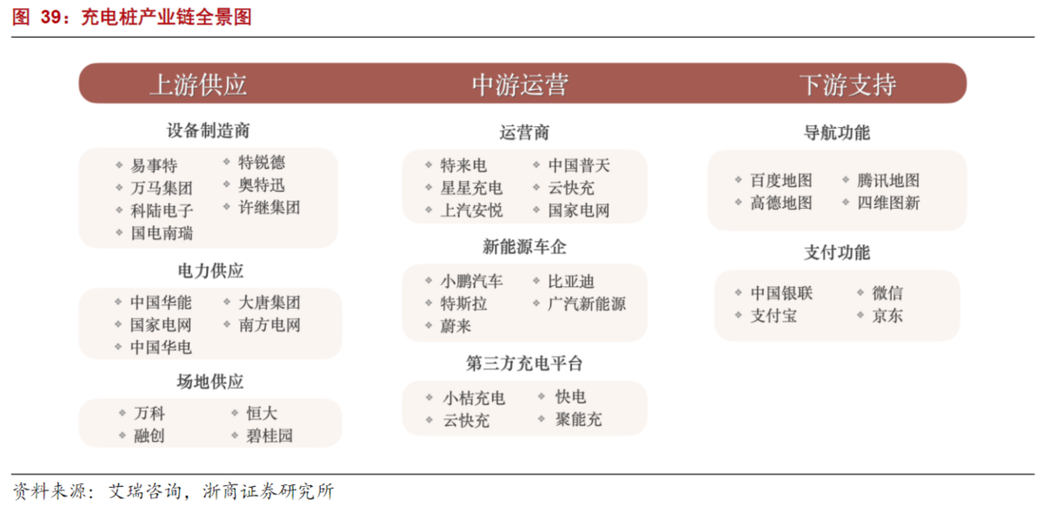 产业链方面,新能源充电桩产业链包括上游充电桩部件制造商、中游充电桩运营服务提供商、下游支持环节。其中设备零部件生产商(装备端)和充电桩运营商(运营端)是充电桩产业链最主要的环节。邱世梁指出,充电桩上游设备竞争充分、中游运营头部集中、下游服务模式仍待探索。