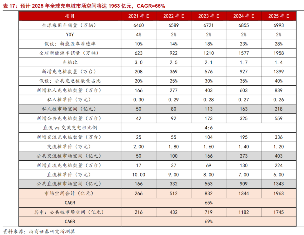 市场规模方面,据中国电动汽车充电基础设施促进联盟数据显示,2017年我国充电桩市场规模仅为72亿元,在市场和政策双因素驱动下,2021年达到419亿元,2017-2021年CAGR为55%,预计到2026年底市场规模有望达2870亿元。浙商证券分析师邱世梁等4月16日的研报预计,2025年全球新增充电桩数量有望达1399万台,对应市场空间达1963亿元,2021-2025年CAGR达65%。