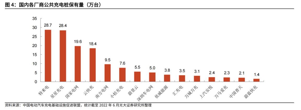 中游运营方面,市场参与者主要为第三方专业运营企业,还有部分车企、能源/电网企业也涉足充电运营服务。2021年公共充电桩运营商top5包括星星充电、特来电、国家电网、云快充、南方电网。杨绍辉认为充电桩运营商头部聚集效应明显。截至2022年6月,全国充电运营企业所运营充电桩数量超1.4万台的共15家,前十五家运营商运营充电桩数量占比92.5%。