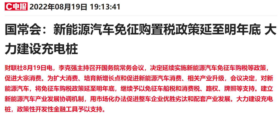 国务院常务会议决定延续实施新能源汽车免征车购税等政策,促进大宗消费。为扩大消费、培育新增长点和促进新能源汽车消费、相关产业升级,会议决定,对新能源汽车,将免征车购税政策延至明年底,继续予以免征车船税和消费税、路权、牌照等支持。大力建设充电桩,政策性开发性金融工具予以支持。