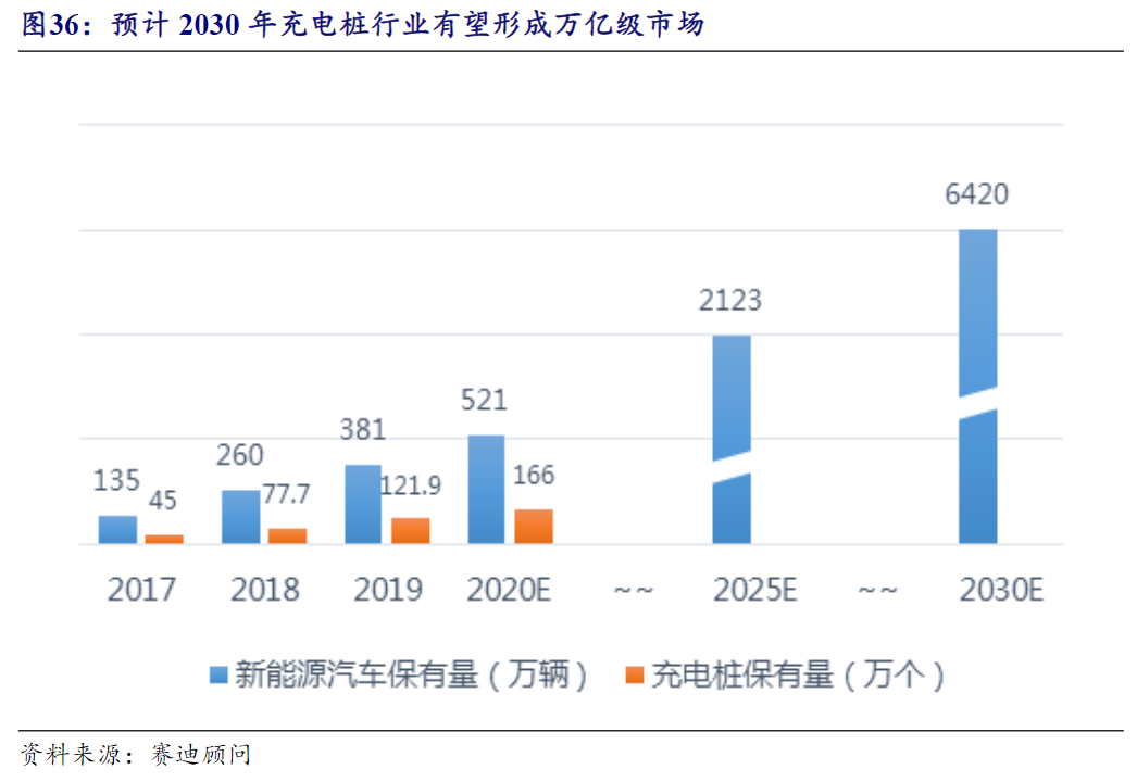 开源证券分析师陈宝健7月19日发布的研报中指出,据工信部《新能源汽车产业发展规划(2021-2035)》,2025年新能源汽车销量占新车销量比重目标达到25%。赛迪顾问预计到2030年,中国新能源汽车保有量将达到6420万辆,根据车桩比1:1的建设目标,未来10年,中国充电桩建设仍然存在约6300万的缺口,预计将形成10253亿的充电桩基础设施建设市场。