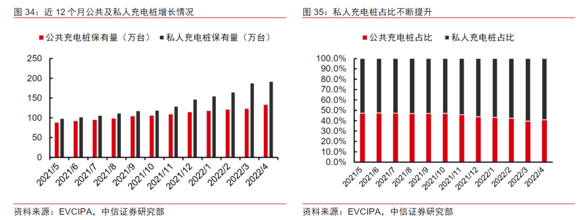 此外,私人充电桩建设加速,增速占比领先。根据中国充电联盟数据,2022年1-5月,充电基础设施增量为96.3万台,其中公共充电桩增量同比上涨253.8%,随车配建私人充电桩同比上升516.5%。