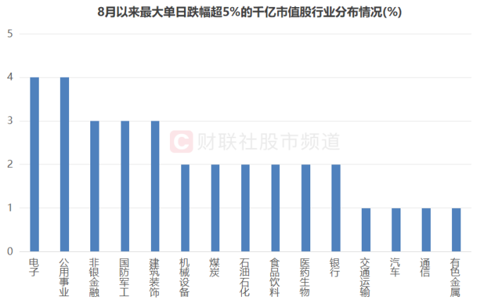 注:8月以来最大单日跌幅超5%的千亿市值股行业分布情况(截至9月11日收盘)