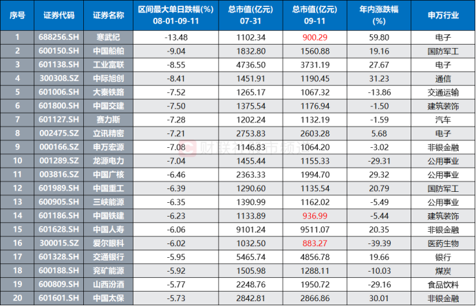 注:8月以来最大单日跌幅居前的千亿市值股(截至9月11日收盘)