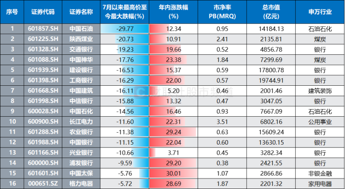 除长江电力外,其余多只红利人气权重也于近期大幅走低。以总市值超2000亿元的中证红利成分股统计,截至今日收盘,16只个股自7月以来平均最大回撤近14.5%,其中,中国石油、陕西煤业、交通银行、中国神华、建设银行最高回撤幅度分别达29.8%、20.7%、19.2%、17.8%、16.5%。此外,值得注意的是,兴业银行、中国建筑近期年内涨幅大幅收窄,年线位于收跌边缘。