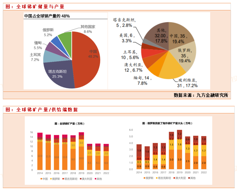 锑金属的价格主要受到供需两端影响,因为锑金属较为稀缺,随着全球不断的开采,锑矿的品位在下降,全球锑资源储采比仅16年,中国更是仅5.8年,锑金属稀缺程度极高。高强度开采下中国锑资源储量减少、品位下降情况加剧,且多年来未发现规模较大的、易采选的锑矿床,伴随着锑矿开采深度和难度加大、开采品位持续下降、选矿回收率下降、环保成本提高,中国锑矿产量呈现下降趋势;海外锑供给主要边际变化在俄罗斯及塔吉克斯坦,俄罗斯极地锑产量不确定性较大。