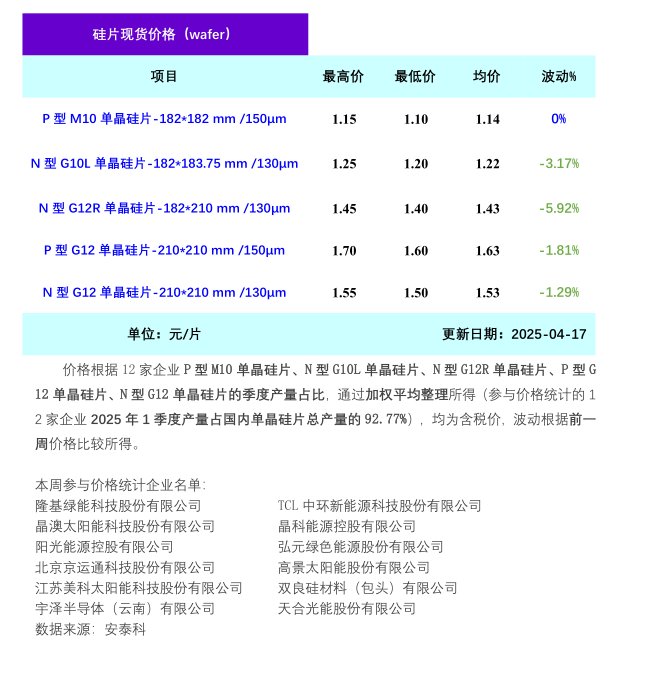 4月17日,硅业分会发文称,本周硅片价格大幅下跌,其中N型G10L单晶硅片(182*183.75mm/130μm/256mm)成交均价在1.22元/片,周环比跌幅3.17%;N型G12R单晶硅片(182*210mm/130μm)成交均价在1.43元/片,周环比跌幅5.92%;P型G12单晶硅片(210*210mm/150um)成交均价在1.63元/片,周环比跌幅1.81%;N型G12单晶硅片(210*210 mm/150μm)成交均价在1.53元/片,周环比跌幅1.29%。本周上下游看跌后市情绪较为浓厚,部分企业恐慌性低价出货,硅片价格继续下行。