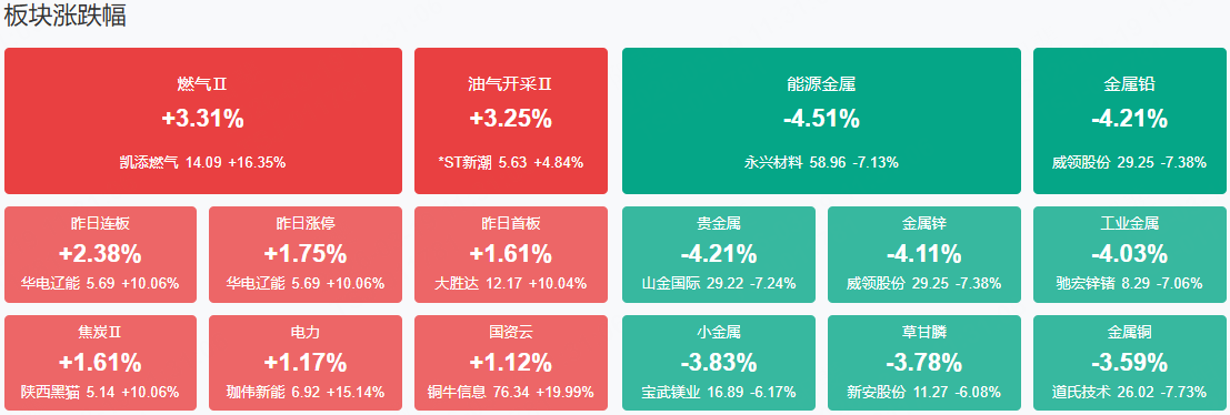市场早盘震荡调整,沪指跌近1%,深成指跌逾1%。沪深两市半日成交额1.3万亿,较上个交易日放量649亿。盘面上题材弱势轮动,全市场4700只个股下跌。从板块来看,绿电、算电协同概念逆势走强,金开新能、东方新能、粤电力A、韶能股份、广安爱众、华电辽能涨停,珈伟新能触及20CM涨停。算力硬件概念震荡回升,源杰科技涨超8%,创历史新高,长光华芯涨超10%。算力租赁概念反复活跃,美利云2连板,贵广网络、铜牛信息、利通电子涨停。下跌方面,有色金属板块跌幅居前,威领股份、山金国际、中金黄金、宝武镁业纷纷下挫。