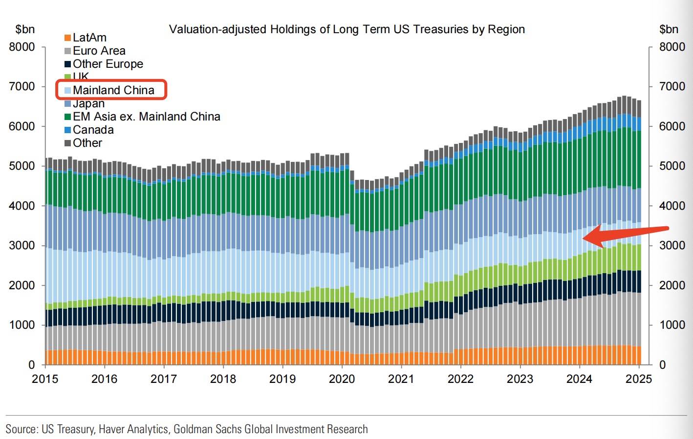 高盛新兴市场策略师孙璐则表示,近期关税加码以及美债利率上升,客户普遍关注美国最大“债主”之一的中国是否抛售美债。“我们观察到中国+比利时+卢森堡的美债持仓近年来基本持平(后两者通常被视为中国通过Euroclear和Clearstream的代理账户),中国外储中的黄金占比增长也较小(自2022年仅增加约200亿美元)。”