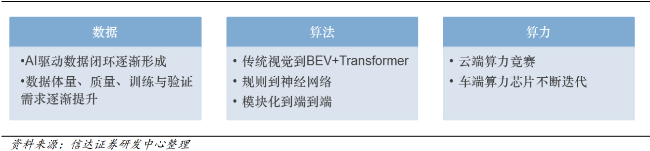 自动驾驶与 AI 应用类似,算法、算力和数据是三大核心竞争要素。把握数据、算力、算法三大核心竞争要素的车企有望率先取得智驾层面的领先优势。