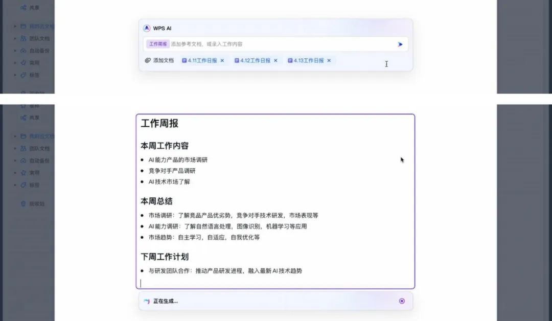 金山办公介绍,在轻文档(airPage)上,接入“WPS AI”后,AI生成的内容可以直接嵌入到文档正文,并能按照当前文档所能支持的格式进行实时渲染;同时,支持多轮对话,通过多次、连续自然语言的输入控制内容的生成,进一步提高创作效率。