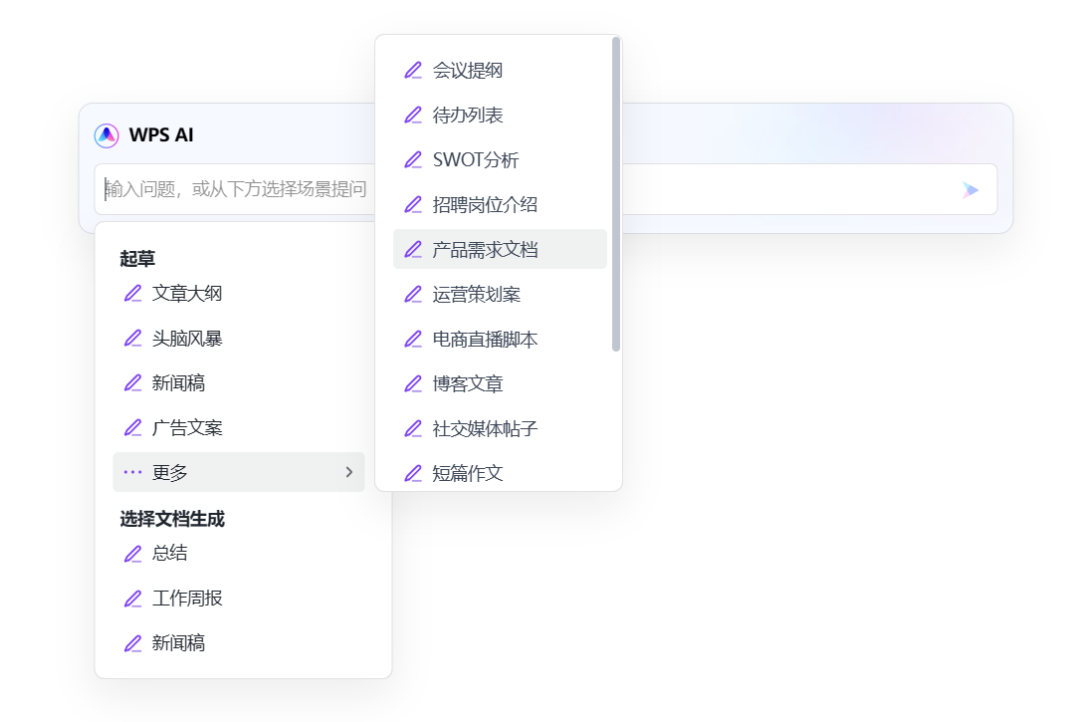 “WPS AI”提供起草、改写、总结、润色、翻译、续写等功能,覆盖了用户大部分使用场景,例如针对用户输入的文字需求,将会帮助用户生成工作总结、广告文案、社媒推文、文章大纲、招聘文案、待办事项、创意故事、旅行游记等。