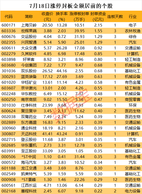 以封单金额计算,上海贝岭、宏辉果蔬、交运股份封单金额居前,分别为2.15亿元、1.55亿元、1.29亿元。