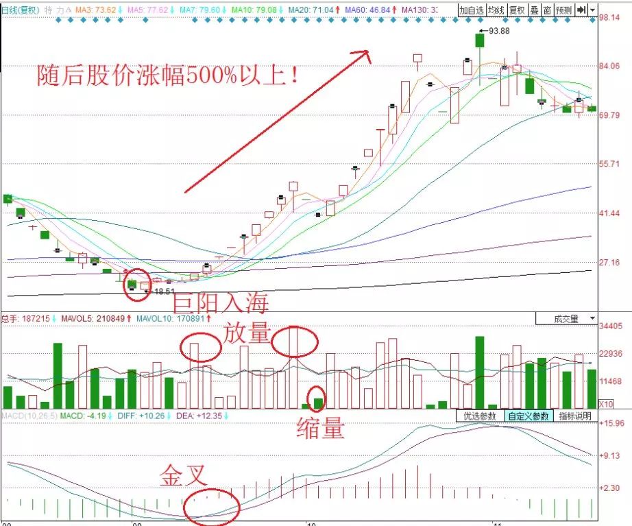 3.如果前期有主力资金流入放量建仓的动作,说明主力资金在运作,那么对“巨阳入海”看涨的确认性就更好;