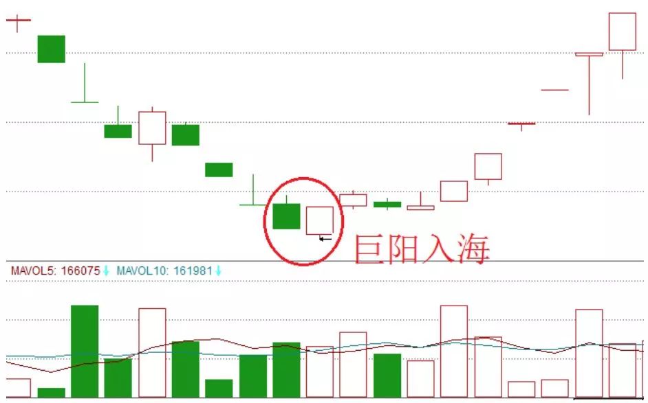 随着股价的下跌,在股价进入到低位区域之后,在某一个交易日股价大幅的低开,但是在盘中却出现了大幅高走,最后在当天收出一根实体非常大的阳线,我们把这根阳线就称为“巨阳入海”。