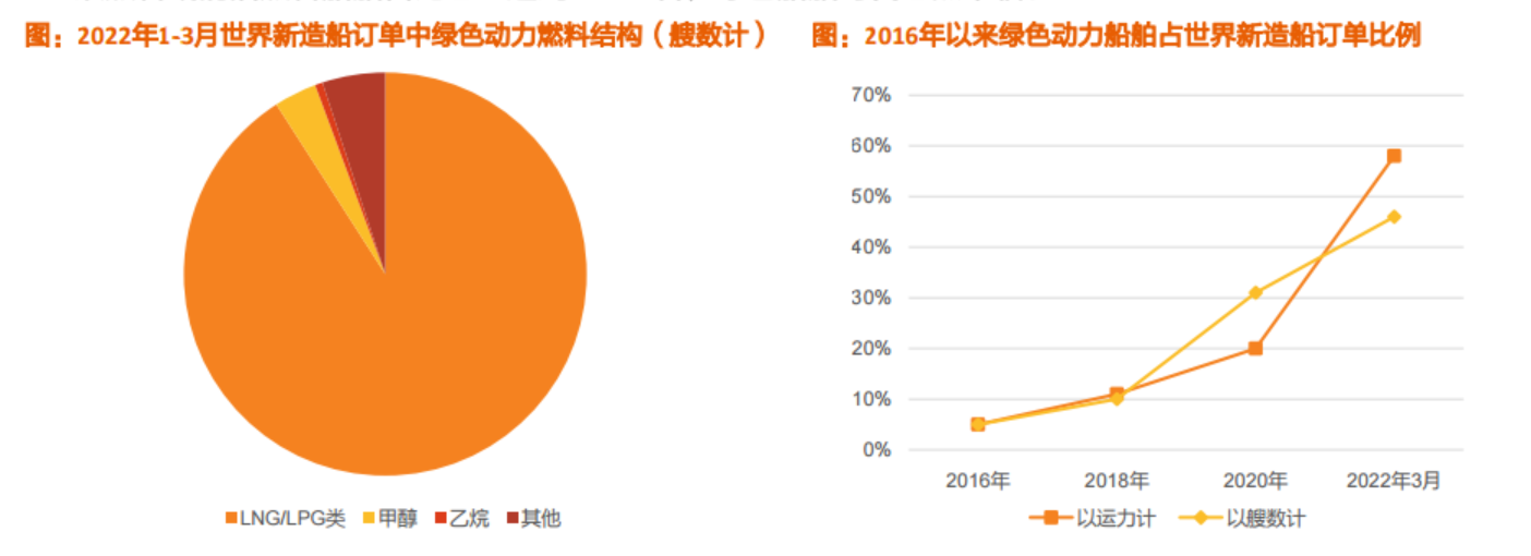 天风证券李鲁靖在9月30日研报中表示,在全球航运业温室气体减排和EEXI和CII的预执行压力下,拆解旧船、建造或改造新能源动力船舶成为船舶市场新周期的主要需求来源。2021年,包括LNG、LPG、甲醇等新型燃料船舶订单达到1680万修正总吨,同比增长118%,占新造船订单中的比重达到36%。