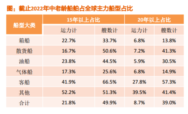 其次,全球船龄结构更迭期临近,克拉克森数据显示,当前全球船队20年以上船龄的船舶运力计占比8.7%,15年以上船龄的船舶运力占到21.8%;以艘数计,20年和15年以上的占比分别高达39%和49.9%。李鲁靖表示,EEXI、CII既可刺激改装,更会促使船东考虑更替方案,这是一个未来几年都将不断发力的潜在市场。
