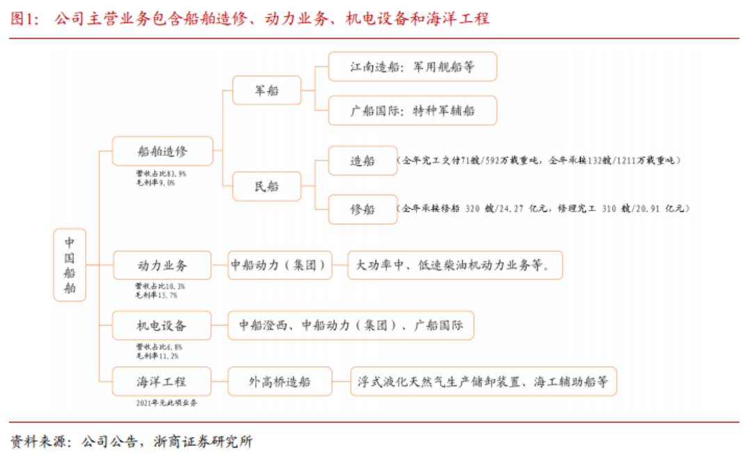 具体来看,中国船舶是国内规模最大、技术最先进、产品结构最全的造船旗舰上市公司之一,其业务涵盖了各式军用舰船、军辅船和散货船、油船、集装箱船、大型邮轮以及各类特种船等民船船型。