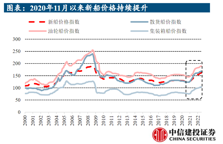 同时,在主流船舶订单爆发推动下,单船成交均值显著提升,2022年前7个月的单船价值达到8473万/艘,相比2021年高出48.2%,创下历史新高,量价齐增下,造船业景气度持续上行。招商证券刘荣10月25日研报中表示,2021年CCI(中国船舶工业协会发布的中国造船产能利用监测指数)也终于回归到荣枯线的位置,船舶行业的又一轮上行周期已经到来。