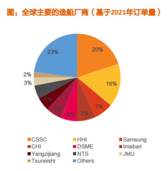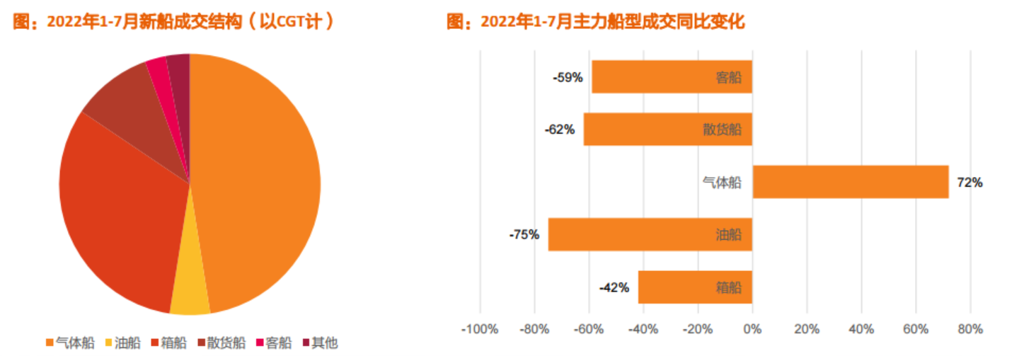 据中国船舶工业行业协会的数据,截至2022年7月底,气体运输船以124艘、913万CGT的成绩超过集装箱船成为到目前为止的市场份额最多的主力船型,其中大型LNG运输船成交101艘,继续突破年度成交纪录。作为LNG船最大建造国的韩国造船业产能全满,订单已经排到五年后。
