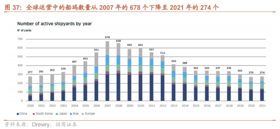 另外,从船舶产能来看,招商证券刘荣10月25日研报中表示,2007年全球运营中的船坞数量为678个,到2021年已经下滑到274个,船舶企业的实际产能已经大幅收缩,船舶产业已经走过了长达十年的产能过剩期,