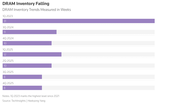 本季度,DRAM芯片的平均库存周期已降至仅八周,远低于去年同期的十周及2023年初的31周。