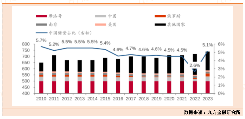 中国磷矿石储量全球第二,但资源量显著低于摩洛哥。根据USGS,全球磷矿资源多集中于非洲、美洲和亚洲。其中,摩洛哥是全球第一大磷矿石储量国,2023年储量约500亿吨(全球占比高达67.6%)。中国磷矿石储量常年位居全球第二,但整体资源量远低于摩洛哥。2023年国内储量约38亿吨(全球占比仅5.1%)。
