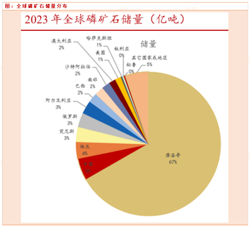 首先磷矿石是一种重要的不可再生资源,磷矿是磷复肥、饲料的重要原料,也是精细磷化工产品、新能源电池的磷源,在国民经济和社会发展中有重要作用,关系到国家的粮食安 、经济安全。从全球范围看,磷矿资源主要分布在非洲、美洲及亚洲,其中 80%以上的磷矿资源集中分布在摩洛哥和西撒哈拉、南非、美国、中国、约旦和俄罗斯。根据 USGS 数据,2023年我国磷矿石储量仅为38亿吨,磷矿石产量为0.9亿吨;我国磷矿开采量大,但储量却不高,储采比高达42.2,远远低于全球平均水平。目前磷矿已被我国列为战略性矿产资源。