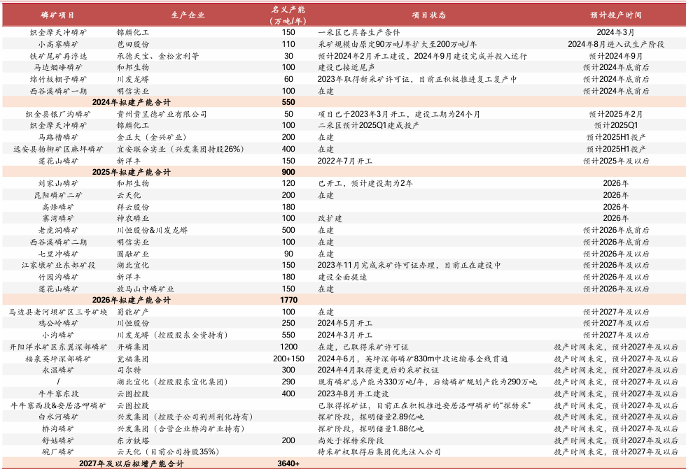 从目前各企业已公布的投产计划上看,未来几年国内磷化工上市企业和非上市企业均存在较多的在建或拟投产能。根据我们的梳理,预计2024-2026年拟增产能分别为550、900、1770万吨,远期规划产能超3640万吨。考虑到矿山项目建设周期较长且国内安全环保政策持续趋严,新增磷矿石实际产量预计将远低于目标规划。主要产能扩张在26年以后,24,25年新增产能不高,同时虽然磷矿建成,新建矿山投产后存产能爬坡期,叠加近年来安全环保政策的持续趋严导致部分新建矿山实际扩产进度不及预期。机构预计2024-2026年国内磷矿石实际产量增量分别约79、351、488万吨。对于目前国内1亿吨的产能来说,新增产能冲击率较低。